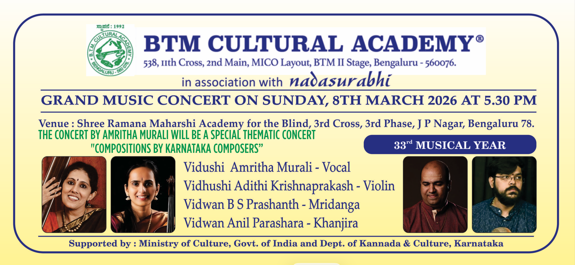 Prize Distribution to the Winners of Music Competition conducted by BTM Cultural Academy in association with Smt. Padmavathy Ananthagopalan Charitable Trust will be held at the same Venue during the event.